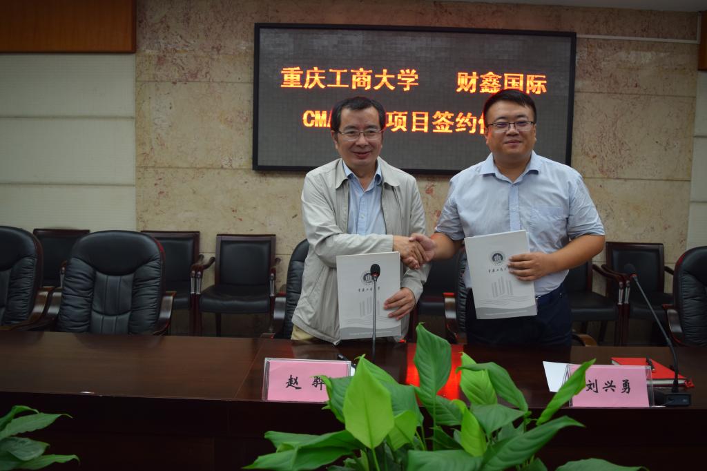 在与会嘉宾的见证下,重庆工商大学副校长赵骅与江苏财鑫教育培训中心总经理刘兴勇签署了合作协议。