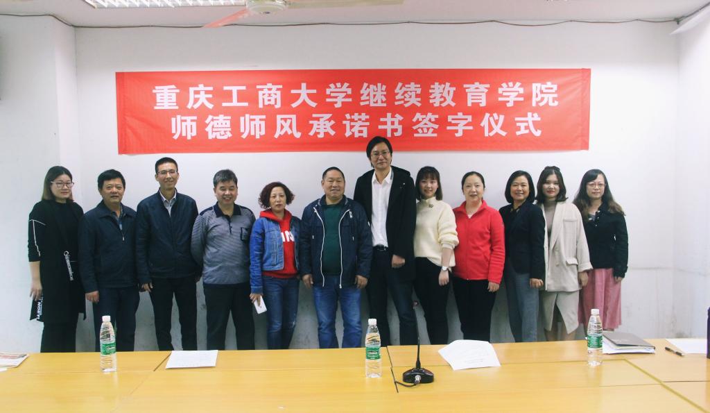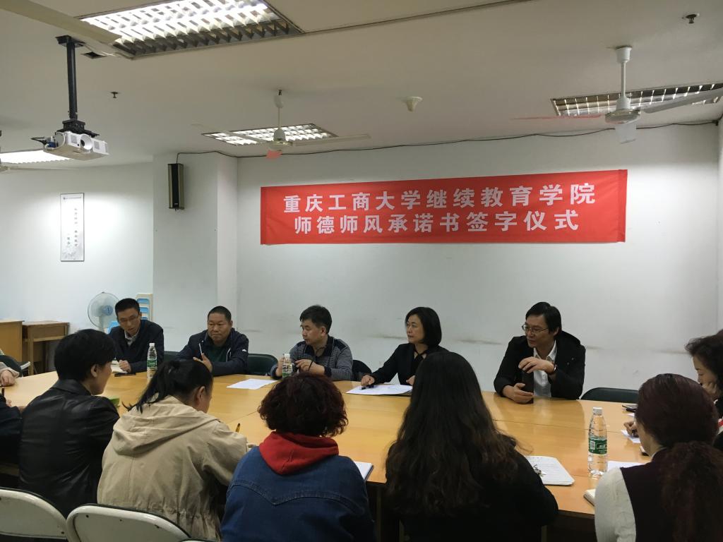 党的十八大以来,以习近平同志为核心的党中央高度重视教育工作和教师工作,将师德师风建设提到了一个前所未有的战略高度。成人高等教育是学校教育的重要组成,ok138cn太阳集团承担了我校成人高等教育数千人的教育教学任务,因此师德师风建设工作一直是学院的重点工作之一。为切实加强师德师风建设工作,进一步明确每位教师对师德师风建设应负的责任,努力提高我院师德师风建设的整体水平,学院于2018年10月15日星期天上午在上清寺函授站召开了师德师风建设专题工作会暨签字仪式。