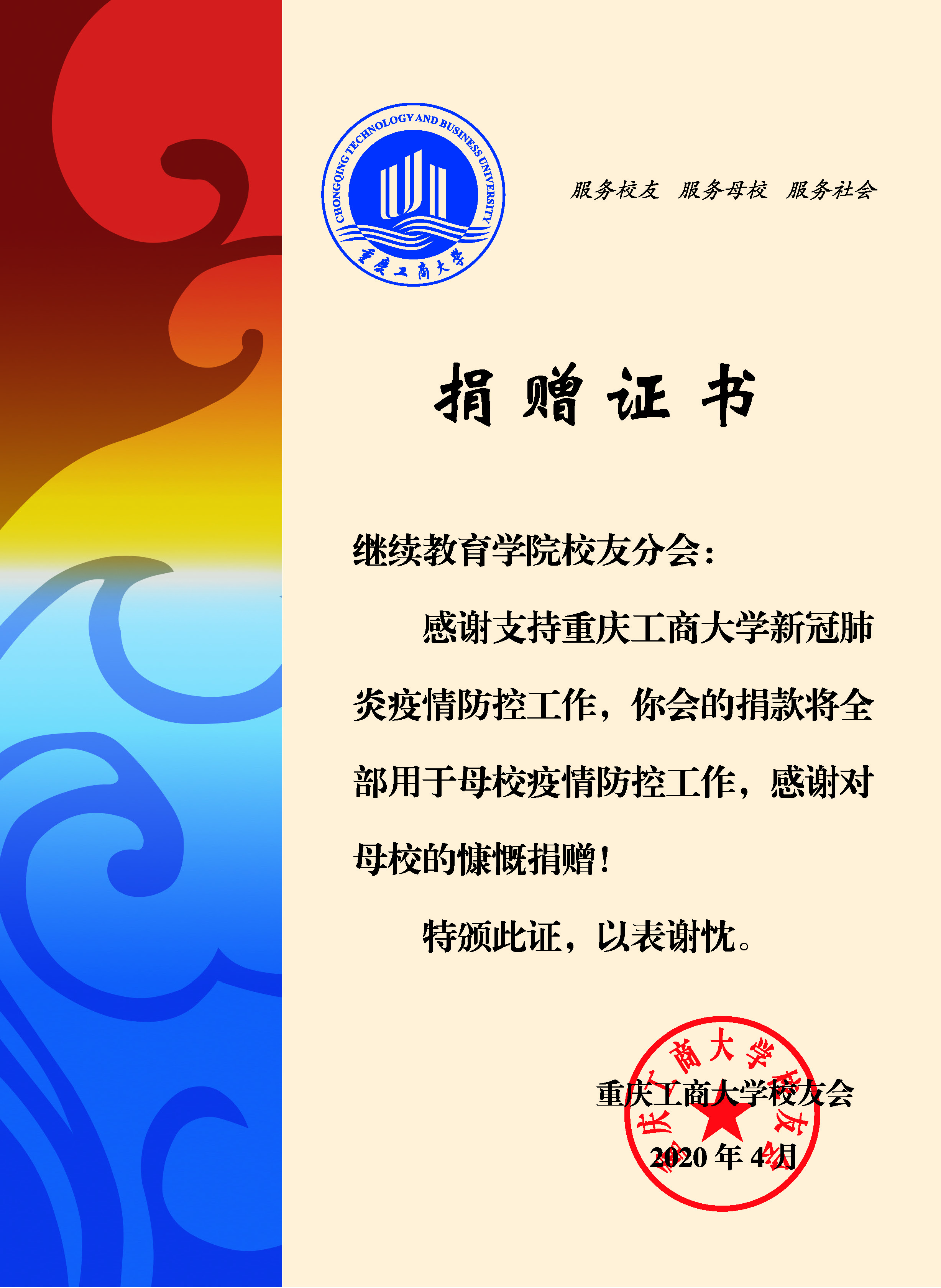 自疫情爆发以来,继续教育校友主动与学校联系,在了解母校疫情抗击情况后,分会秘书处发出捐款倡议, 齐心与母校并肩战斗。ok138cn太阳集团广大校友第一时间积极响应,纷纷自愿捐款,筹集到8346.80元善款,定向用于我校抗疫工作。ok138cn太阳集团校友分会会长杜伟说:“重工商大永远是我们的家。聚沙成塔,滴水泉涌,希望大家都能为母校的疫情防控尽一份绵薄之力。”