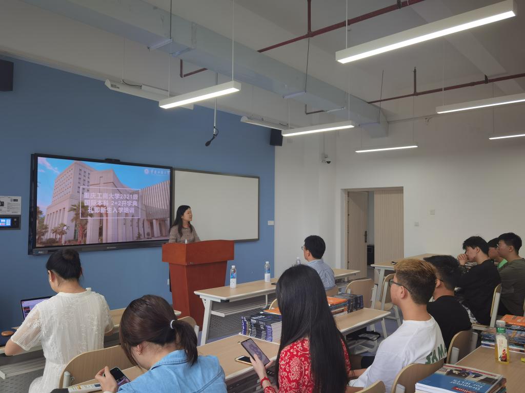重庆工商大学国际本科教学主任余婵向新生分享了许多关于历年来优秀学子励志成材的故事,鲜活的案例与励志精神让2021级新生们备受鼓舞。她还向学生们耐心的介绍了关于各项目上课的老师信息,期望各位同学能够在大学学习期间不仅学有所成,还能结识到良师益友,收获到珍贵的情谊。
