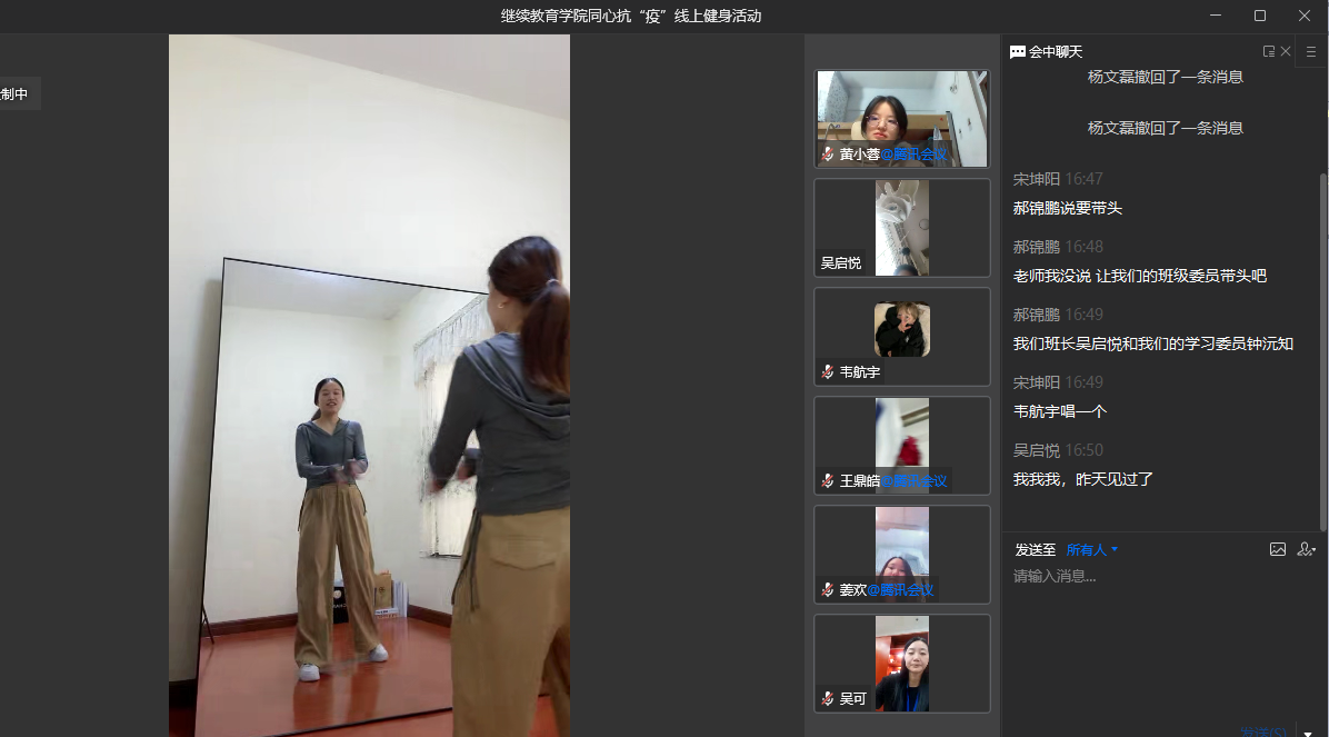 随后,参加活动的师生在学院成慧敏老师的带领下一起跳了健身操,同学们最后兴起,还进行了线上接歌,整个活动氛围轻松融洽。同学们表示,虽然在活动中有的同学还比较腼腆,但大家感受到了学院的用心,也从这几天越来越好的饭菜和送到手上的物资中感受到了学校的温暖,他们一定听从学校的指挥,服从学校的安排,加强锻炼,相信通过大家的共同努力,一定能够战胜疫情。