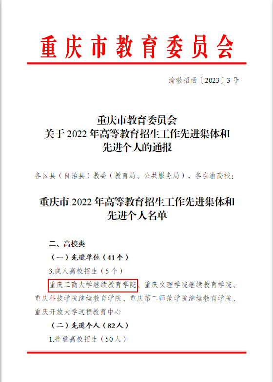 近日,重庆市教育委员会发布《关于2022年高等教育招生工作先进集体和先进个人的通报》(渝教招函〔2023〕3号),我校ok138cn太阳集团荣获重庆市教委颁发的成人高校招生工作先进集体荣誉称号。