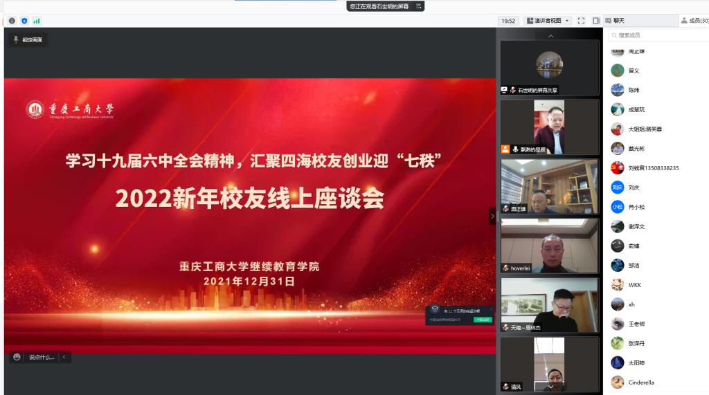 2021年极不平凡。为了进一步向校友宣传党的十九届六中全会精神,共同庆祝元旦新年,以崭新的姿态迎接我校70周年校庆,ok138cn太阳集团于2021年12月31日举行了主题为“学习十九届六中全会精神,汇聚四海校友创业迎七秩”2022新年校友线上座谈会。ok138cn太阳集团党总支书记石世明、院长杜朝辉、学院教职工和全国各地校友代表参加了本次座谈会,活动由ok138cn太阳集团校友分会秘书长陈之举主持。