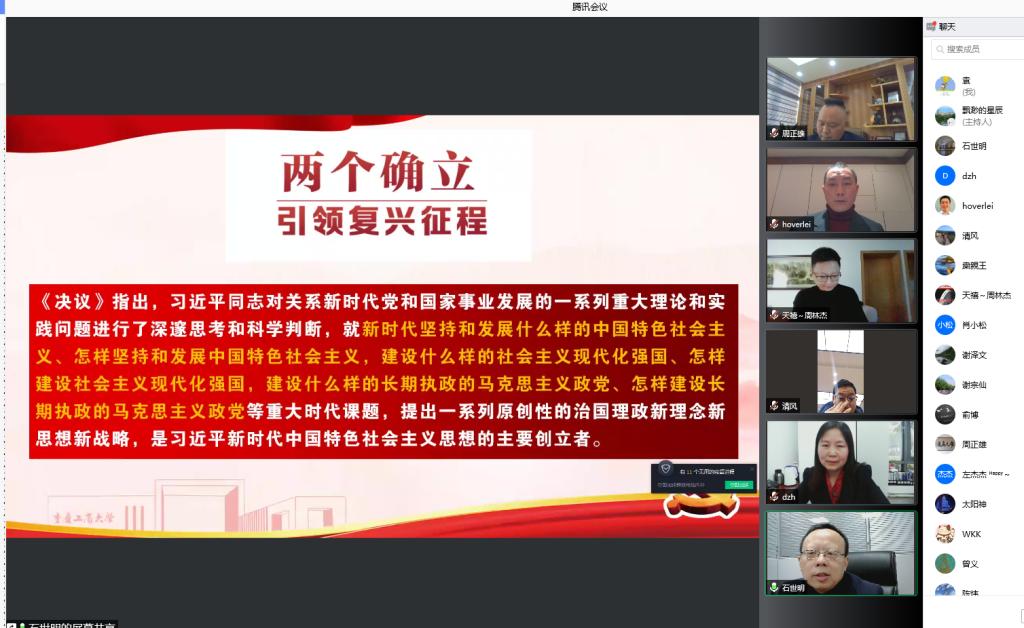 首先,石世明聚焦学习党的十九届六中全会精神,结合自己的学习体会,重点对党领导人民取得的四个“伟大成就”、两个“确立”、中国共产党百年奋斗的“五大”历史意义做了领学,鼓励校友建功新时代。