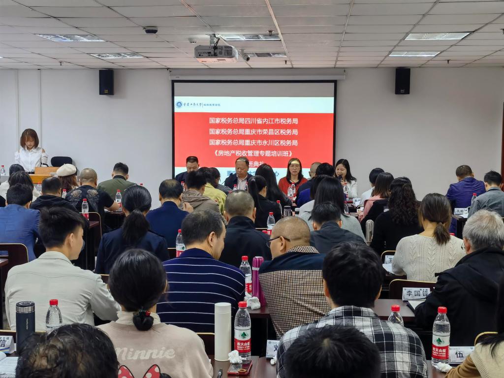 2021年10月14日,荣昌税务局、内江税务局、永川税务局“房地产税收管理”专题培训班在重庆工商大学南岸校区ok138cn太阳集团成功举行联合开班典礼。此次培训是深入贯彻落实习近平总书记关于推动成渝双层经济圈建设重要指示精神、由荣昌税务牵头组织的一次联合培训。重庆市荣昌区税务局王成龙总经济师、重庆市永川区税务局彭先菊副局长、四川省内江市税务局范方林副局长分别带队参训并在开班典礼上讲话。重庆工商大学ok138cn太阳集团院长杜朝辉教授代表学校致开班词。