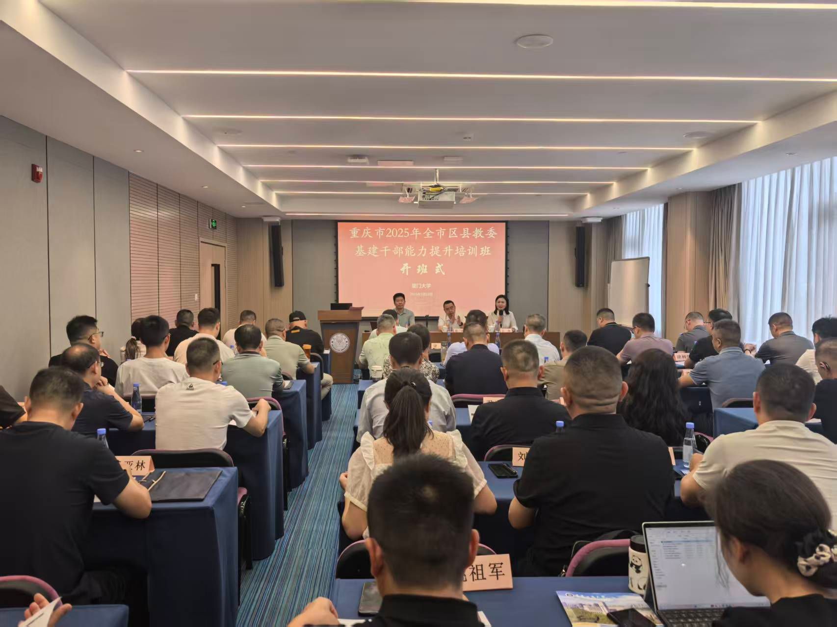 9月22日-26日,我校举办的2025年重庆市区县教委培训班顺利完成。本次培训班由重庆市委教育工委、重庆市教委主办,重庆工商大学承办、厦门大学协办。来自全市41个区县教委基建干部共计50名学员参加培训。重庆市教育委员会基建后勤处处长梁杰、重庆工商大学ok138cn太阳集团院长王燕、中国教育发展战略学会产教融合专业委员会副理事长、厦门大学原ok138cn太阳集团院长许和山出席开班式并讲话。