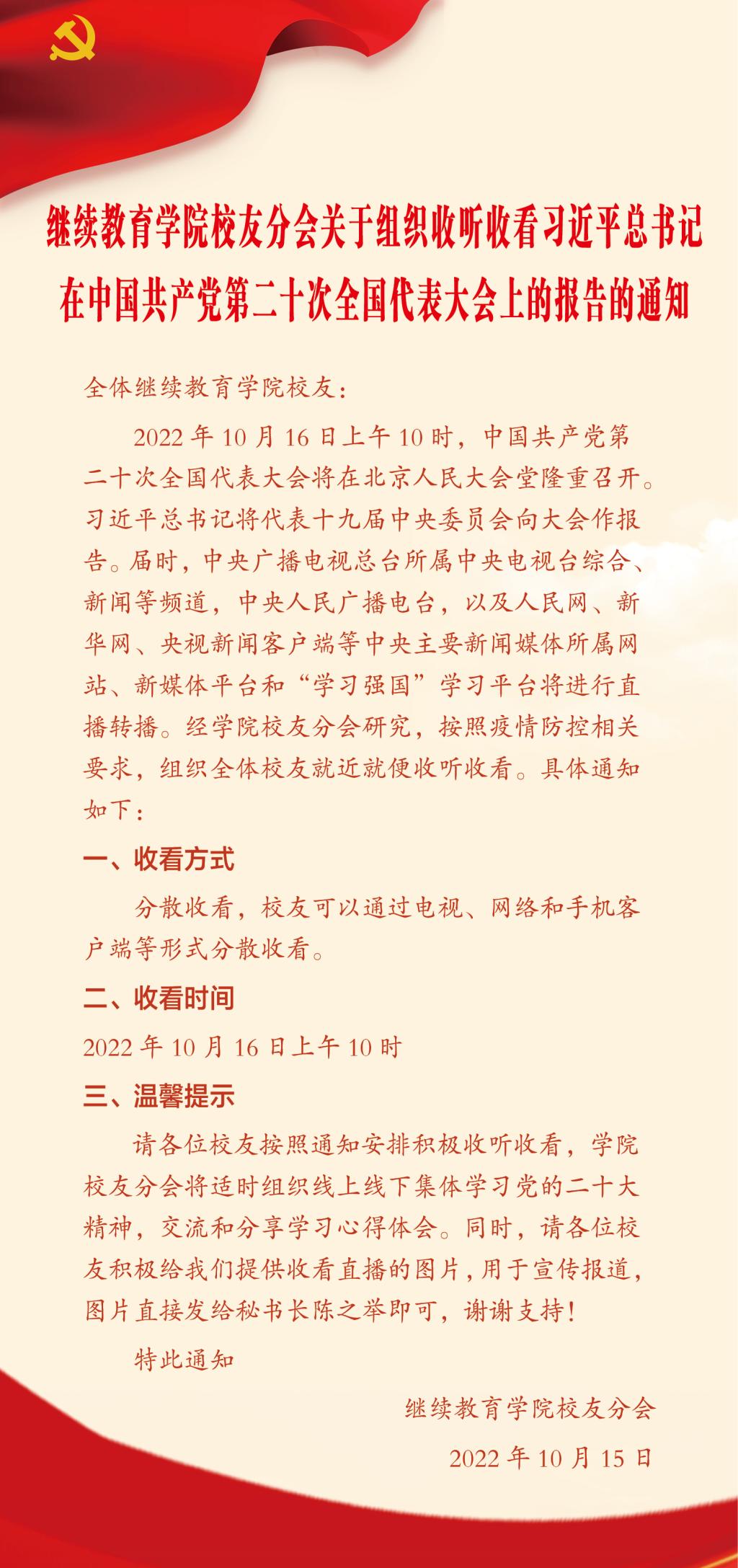 10月16日上午,中国共产党第二十次全国代表大会在北京隆重开幕,ok138cn太阳集团校友分会提前发出通知,积极组织校友收听收看中国共产党第二十次全国代表大会开幕会。校友们积极响应,他们在单位,在工地,在家里……踊跃收听收看开幕会直播的热烈场面。习近平总书记所作的大会报告凝聚人心、催人奋进,大家纷纷表示,在迈上全面建设社会主义现代化国家新征程、向第二个百年奋斗目标进军的关键时刻,要继续坚定不移跟党走,坚持走中国特色社会主义道路,以中国式现代化推进中华民族伟大复兴。